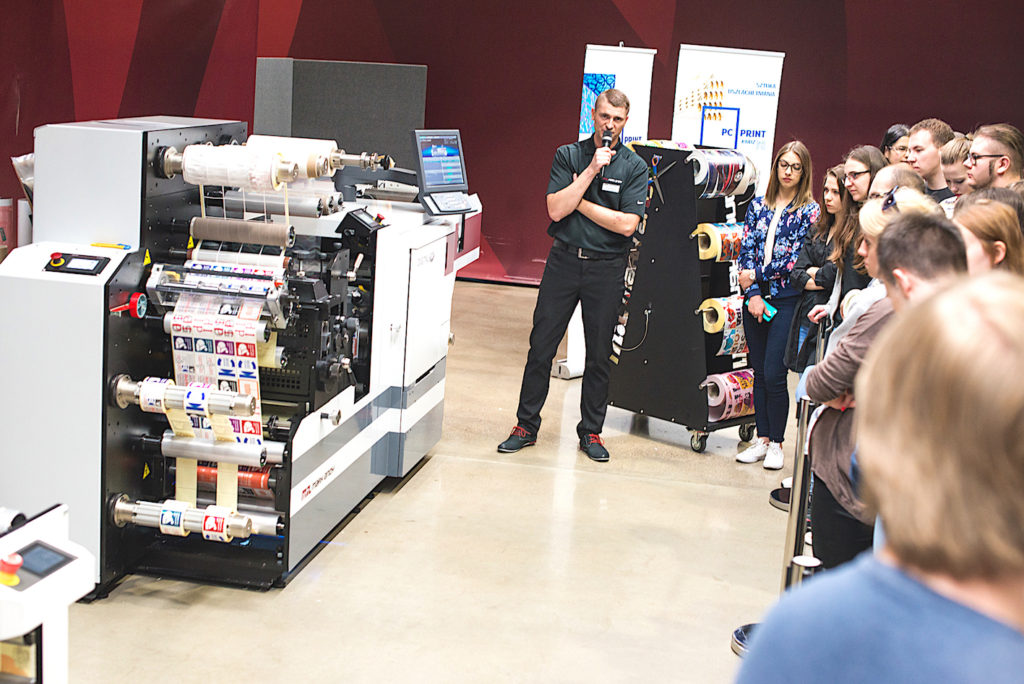 The theory session was followed by Michal Mokrzycki and Grzegorz Rostkowski, print instructors at Mark Andy Europe, giving a practical demonstration of the three different presses installed at the demo centre: a P7 Performance Series flexo press, and two flexo/digital hybrid models, Digital Series and Digital One. Print demonstrations included jobs prepared by the participating students. On the P7, a set of self-adhesive white labels prepared by Flexmar prepress studio was printed, using two different Dupont plates (ESX and ESM).